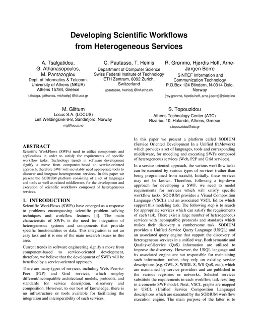 - Aphrodite Tsalgatidou, Georgios Athanasopoulos, Michael Pantazoglou, Cesare Pautasso, Thomas Heinis, Roy Grønmo, Hoff Hjørdis, Arne Berre, Magne Glittum, Simela Topouzidou, Developing scientific workflows from heterogeneous services, SIGMOD Record, 35:22-28, June 2006