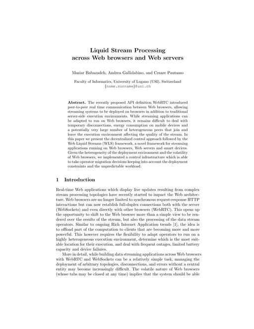 - Masiar Babazadeh, Andrea Gallidabino, Cesare Pautasso, Liquid Stream Processing across Web browsers and Web servers, Proc. of the 15th International Conference on Web Engineering (ICWE 2015), Rotterdam, NL, June 2015, pp. 24-33