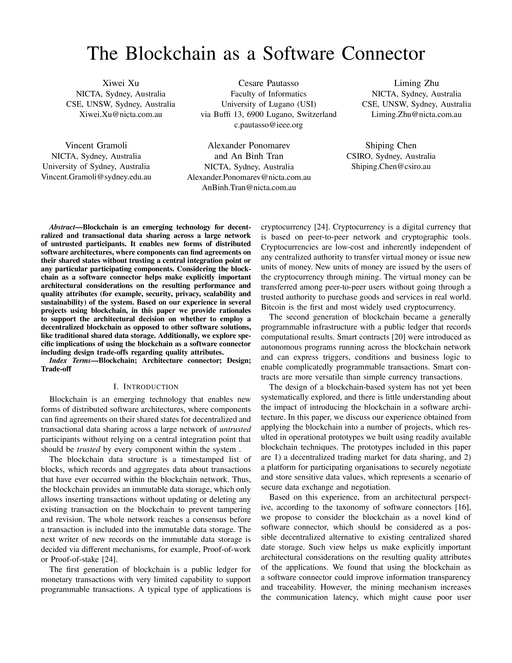 - Xiwei Xu, Cesare Pautasso, Liming Zhu, Vincent Gramoli, Alexander Ponomarev, An Binh Tran, Shiping Chen, The Blockchain as a Software Connector, Proc. of the 13th Working IEEE/IFIP Conference on Software Architecture (WICSA 2016), Venice, Italy, April 2016