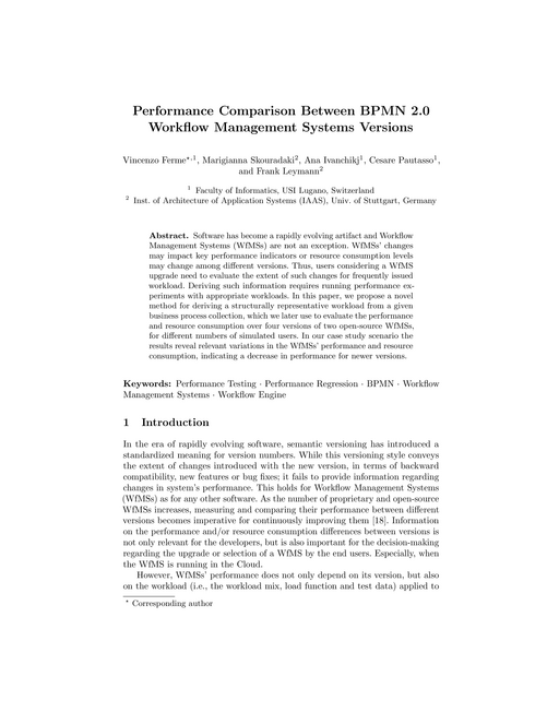 - Vincenzo Ferme, Marigianna Skouradaki, Ana Ivanchikj, Cesare Pautasso, Frank Leymann, Performance Comparison Between BPMN 2.0 Workflow Management Systems Versions, Proc. of the 18th Working Conference on Business Process Modeling, Development, and Support (BPMDS 2017), Essen, Germany, June 2017