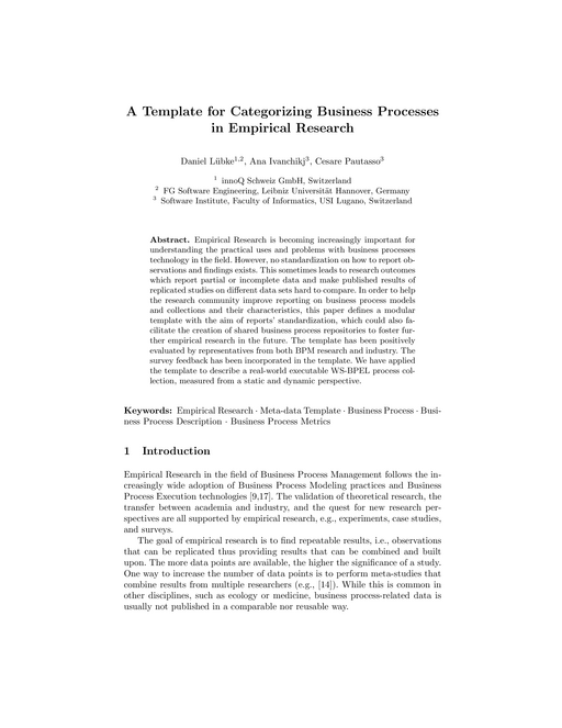 - Daniel Lübke, Ana Ivanchikj, Cesare Pautasso, A Template for Sharing Empirical Business Process Metrics, Proc. of the BPM Forum, Barcelona, Spain, September 2017, pp. 36-52