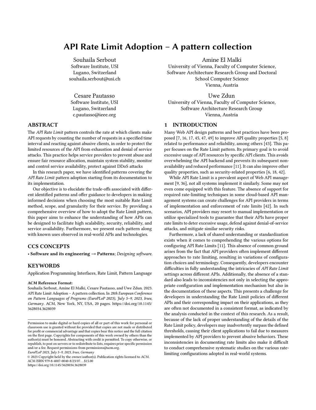 - Souhaila Serbout, Amine El Malki, Cesare Pautasso, Uwe Zdun, API Rate Limit Adoption - A Pattern Collection, Proc. of the 28th European Conference on Pattern Languages of Programs (EuroPLoP), Kloster Irsee, Germany, July 2023