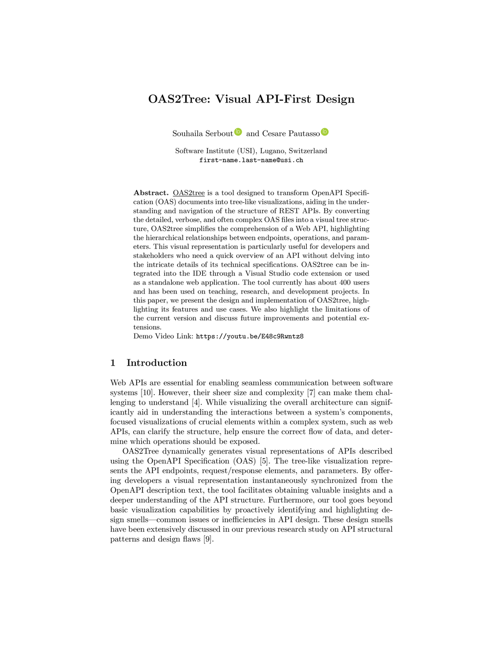 - Souhaila Serbout, Cesare Pautasso, OAS2Tree: Visual API-First Design, Demo at the 18th European Conference on Software Architecture (ECSA), Luxembourg, September 2024